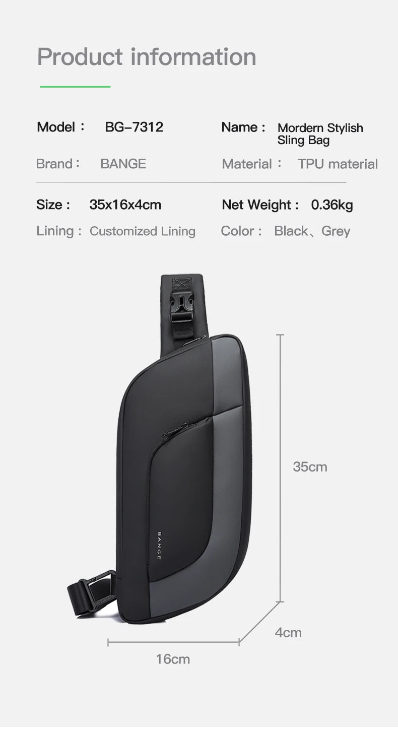 The BANGE BG-7312 Chest Bag is designed for modern men who value versatility, security, and sleek design. Made from waterproof TPU material with anti-stain properties, this multifunction crossbody sling bag is perfect for short trips, commuting, and urban exploration.